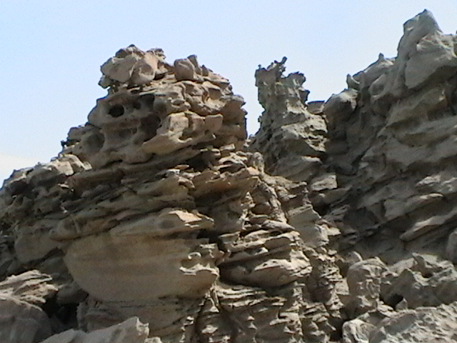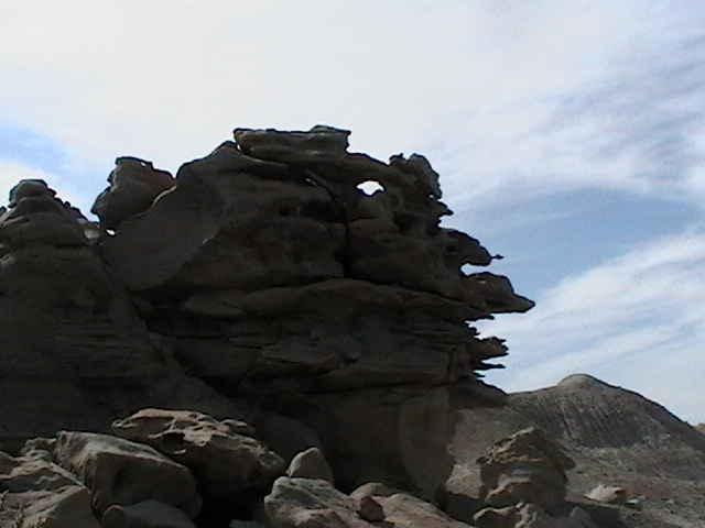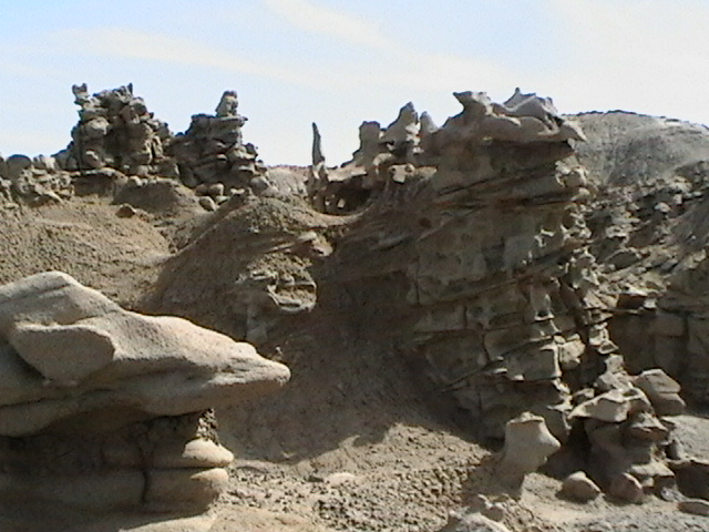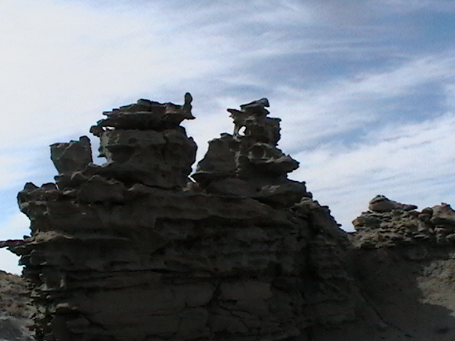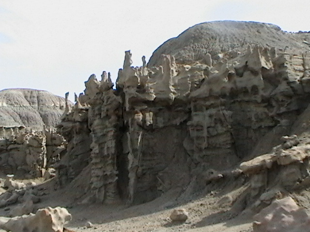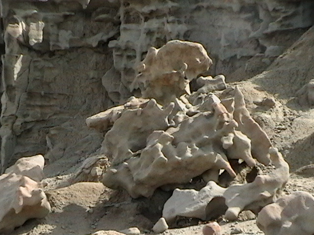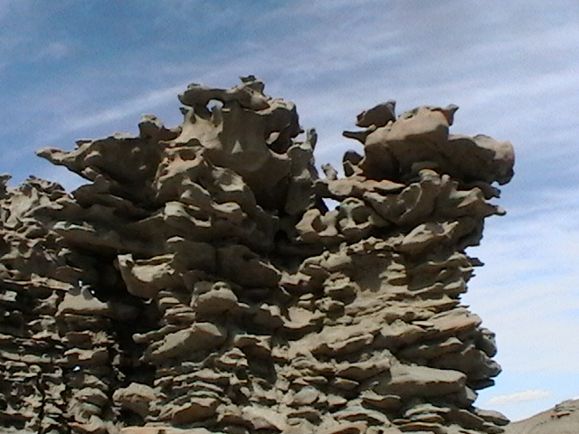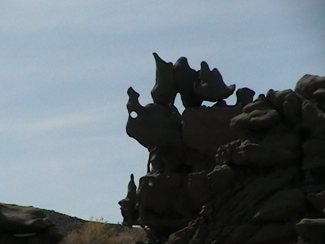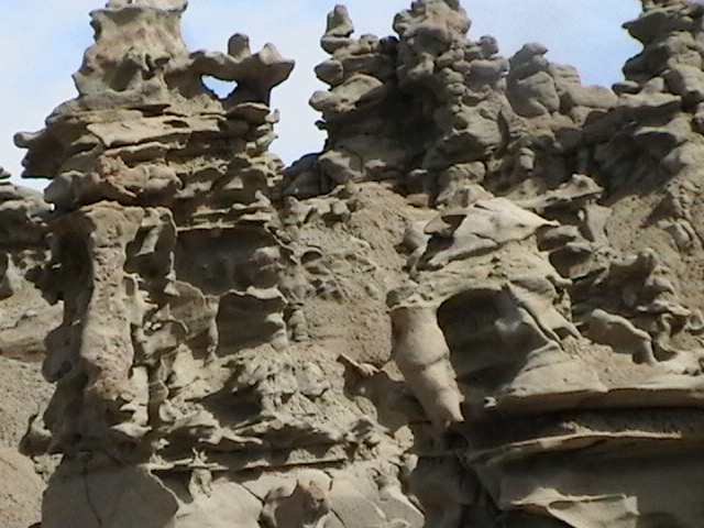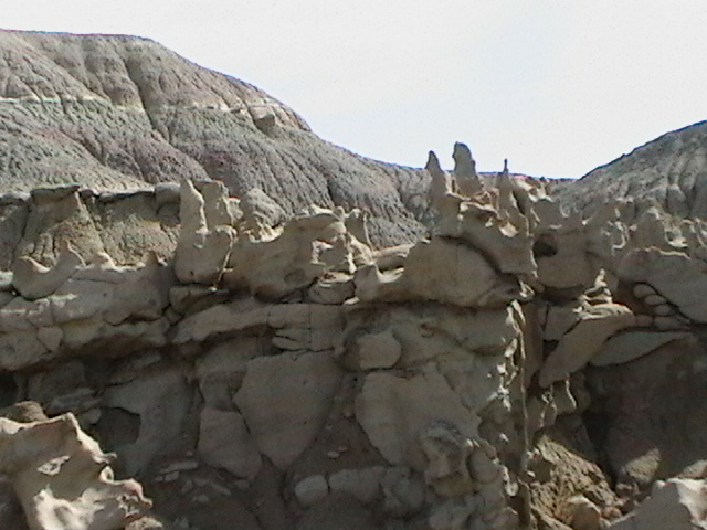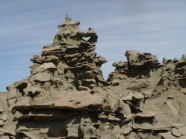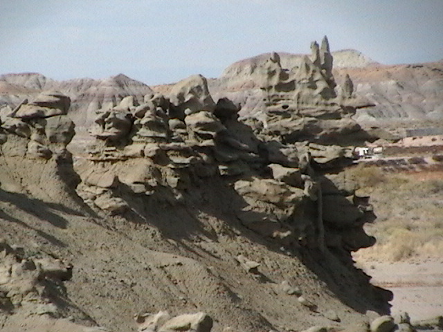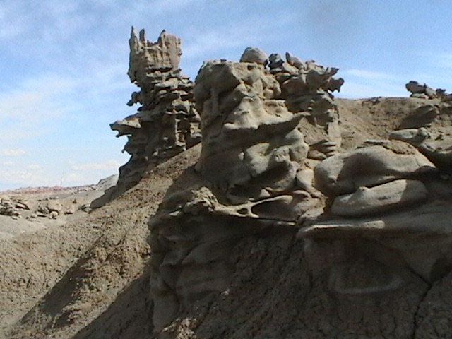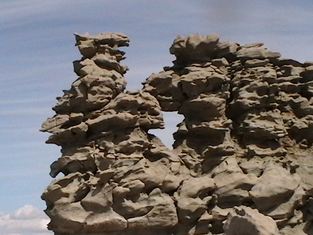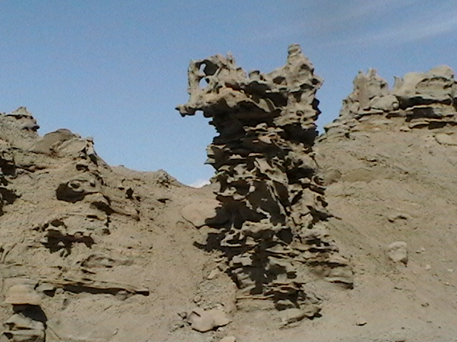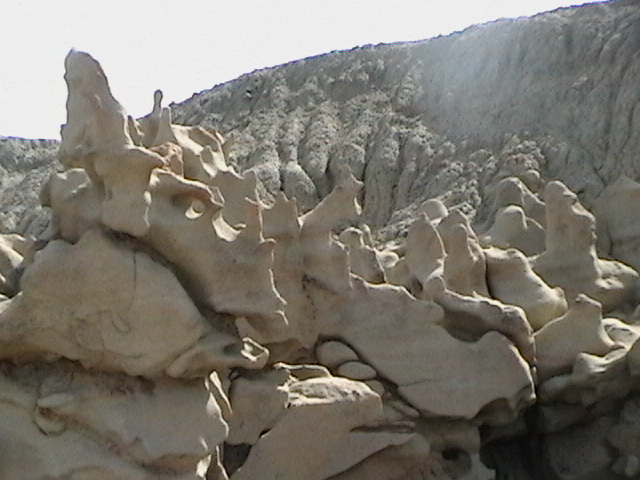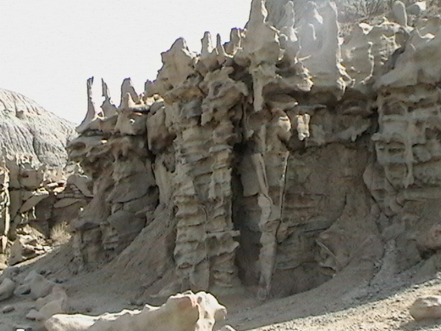 Fantasy Canyon is located about 40 miles south east of Vernal, Utah. Vernal is at the north eastern section of Utah. We took I-70 and at Exit 157 turned north into US-6 and US-191. US-6 and US-191 part a little beyond Price. One needs to follow US-191 to Vernal. After parting with US-6, US-191 enters a mountainous terrain. This portion of US-191 is a senic drive. About 40 miles after parting from US-6, US-40 joins US-191 and goes into Vernal together. Within Vernal this route is called Main Street. Other streets that are diagonal to Main Street are divided into north and south sections. Vernal Ave. is another street with a normal name and is diagonal to Main Street. Vernal Ave. divides the town into west and east sections. Other roads thus have interesting names like N 100 W, W 200 S, and so on depending on which one of four sections the street is located. At the cross section of Main Street and Vernal Avenue, US-40 and US-191 branch off, with US-191 going north along Vernal Ave., and US-40 continueing toward east along Main Street. To Fantasy Canyon, one needs to follow US-40 East. At S 500 E Street, make a right turn and there is a field office of Bureau of Land Management (BLM) that manages Fantasy Canyon. Fantasy Canyon is not a state park, but is in the middle of Indian land. That area has many oil fields and numerous oil field service roads most of which are not on official map. It is a good idea to get a map and information about Fantasy Canyon in the BLM field office. To continue to Fantasy Canyon, one needs to turn back to US-40 East and follows it for a while. At a traffic light, turn right into Utah State Route 45, and drive south along this road. The traffic on this road are mostly oil-field service vehicles. At the intersection with Glen Bench Road, there is a BLM sign pointing toward Fantasy Canyon. This BLM sign is not large and is easy to miss. Before coming up to the BLM sign there is a big sign of "Red Wash", prodding visitors to Red Wash to turn left. Red Wash is a recreational area, but we do not know details about it. Very shortly after the Red Wash sign, BLM sign and the intersection with Glen Bench Road comes up at the right hand side. Glen Bench Road is a paved road. About 0.3 mile after entering Glen Bench Road, Glen Bench Road curves toward left. If keep going straight, we have no idea where it will lead to. Follow Glen Bench Road for a while until another similary paved road called Watson Road joins Glen Bench Road from right. At that intersection, another BLM sign prods visitors to Fantasy Canyon to turn left into a dirt road. After entering into the labyrinth of oil-field service roads, BLM signs become the only guide. It is better to memorize the turns since on the way out BLM signs for exit will be much less frequent than the way in. It is said that especially after dark, it is very difficult to get out of Fantasy Canyon and back to the paved Glen Bench Road. After crossing a wash (dry when we visited), the parking area is not far away. At our visit there was no other cars there. From the visitors sign-in book, looks like only have one or two visitors per day at that time. It should also be mentioned that there are baby rattle snakes (also called pygmy rattle snake) in the canyon, but they are rarely seen. The dirt raod to the canyon becomes unpassable when wet.