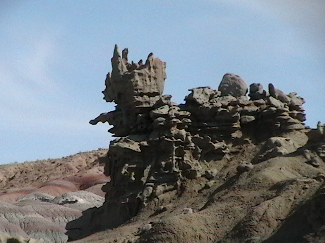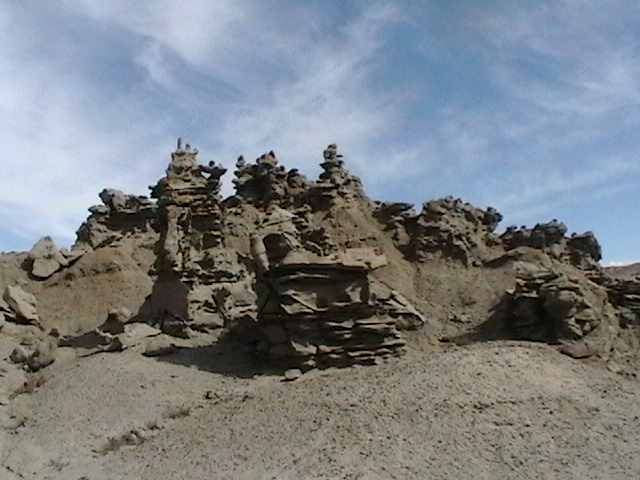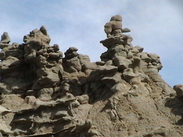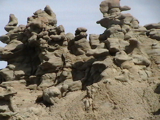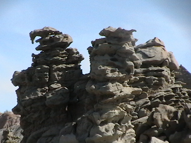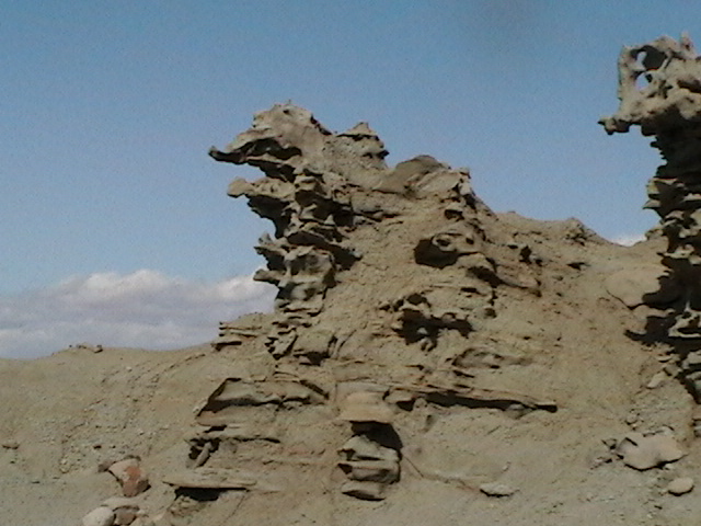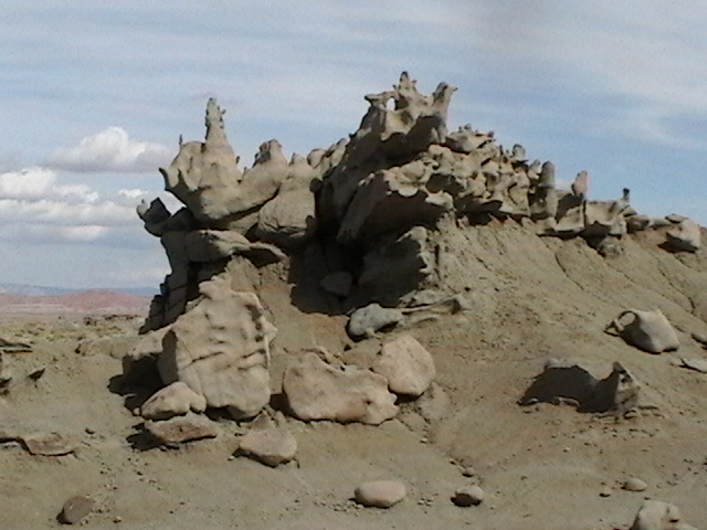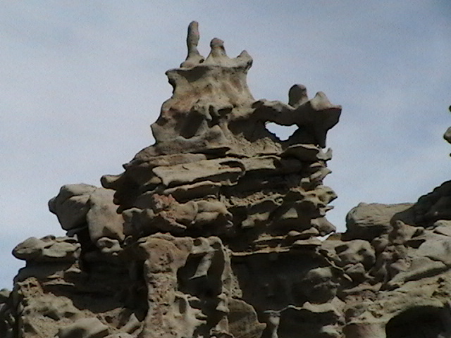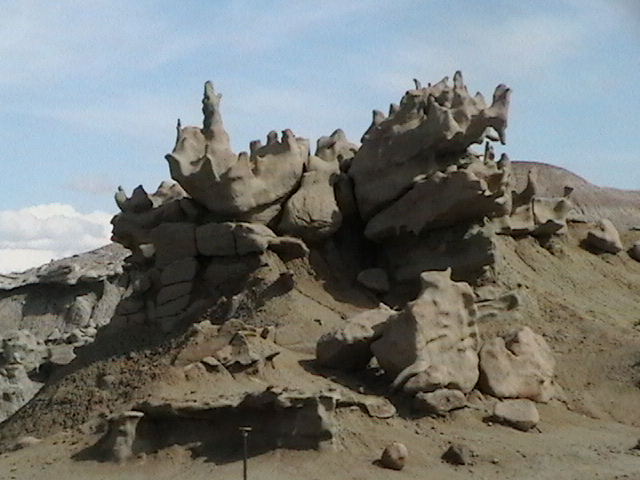 There are 20 or more delicate structures in Fantasy Canyon, and are immediately approachable from the parking area. The tallest one was called "Teapot". A picture with a full moon shining through Teapot was the land mark picture of the canyon. Unfortunately in September of 2006, Teapot was found to have toppled from its foundation and shattered on the canyon floor. The night before the discovery, there were three visitors camping there overnight. On investigation, it is said that the destruction of Teapot was probably caused by vendalism. Many suspect that someone tried to climb up that delicate structure and caused its demise. After that incident, experts are fearful that the remaining structures will meet same fate as Teapot. That is probably why advertisement about Fantasy Canyon is so low key that most people do not know about the canyon. Each of the major structure in the canyon has a name, but people can hardly match the names with the shapes of the structures. Some pictures of those structures are included without any comment; everything is just dumped on viewer's fantasy.