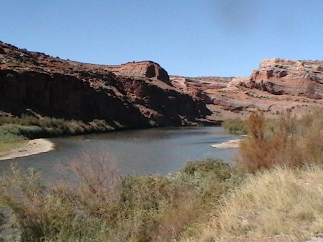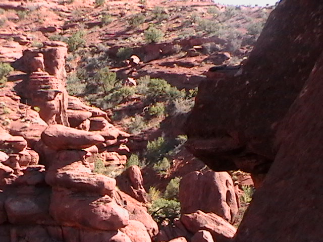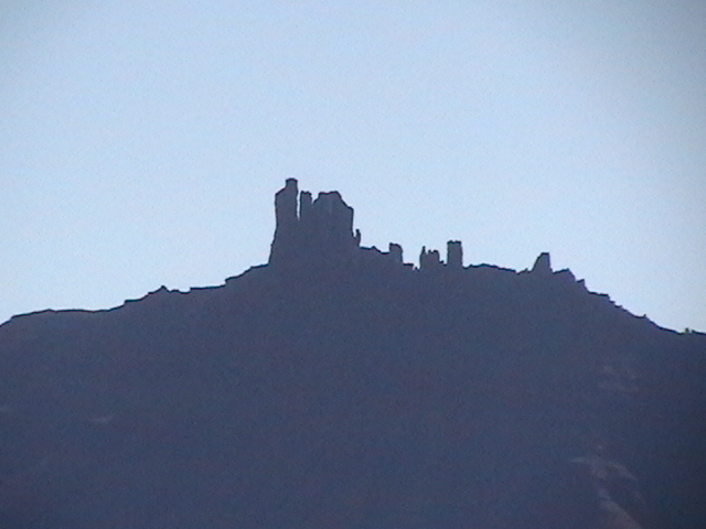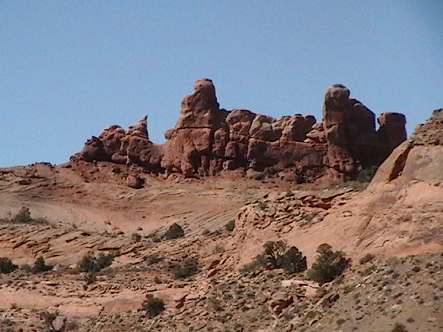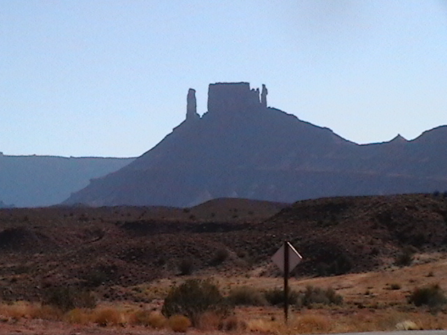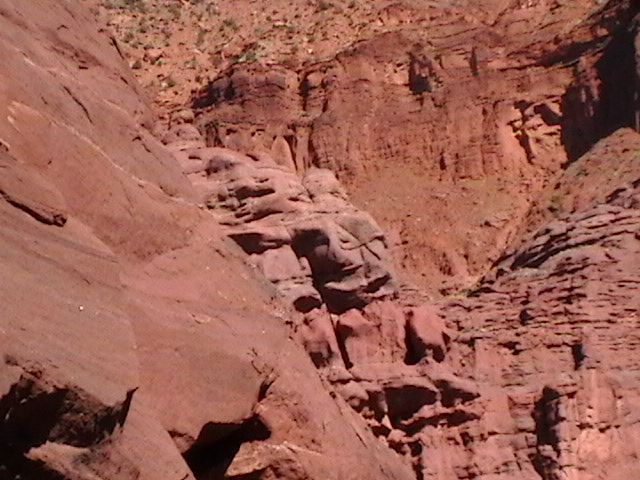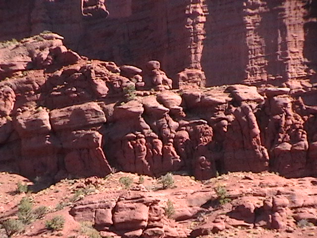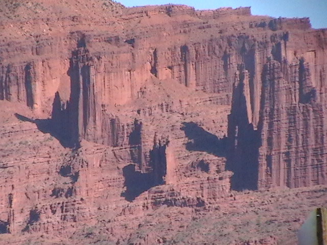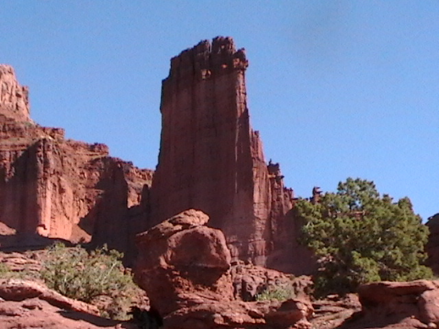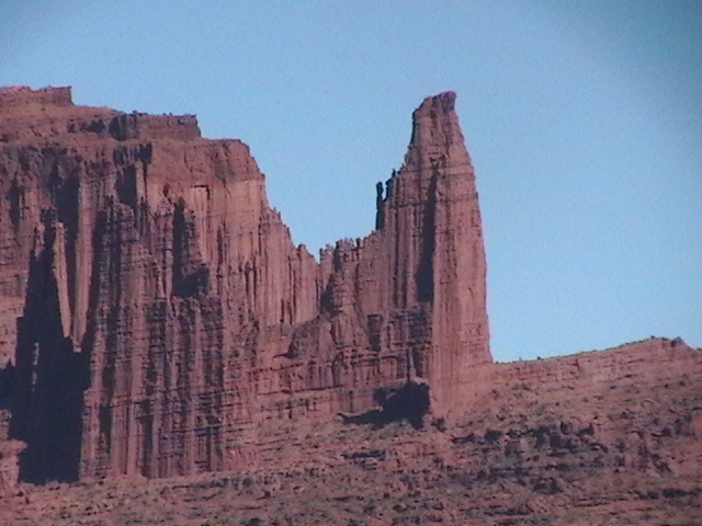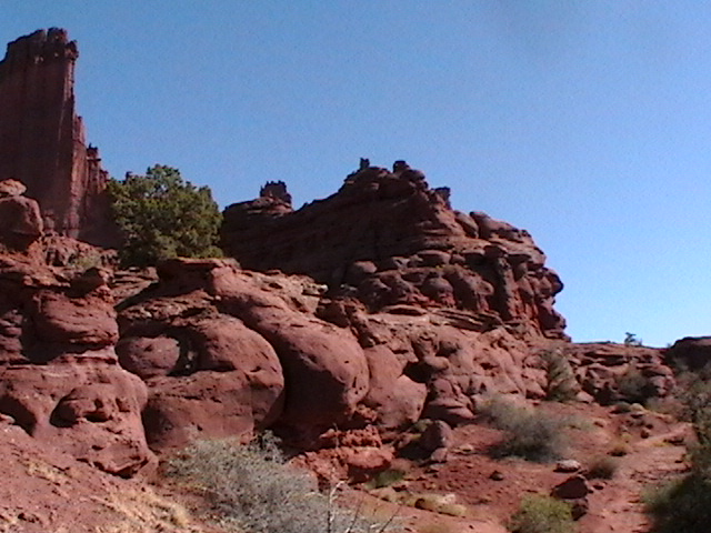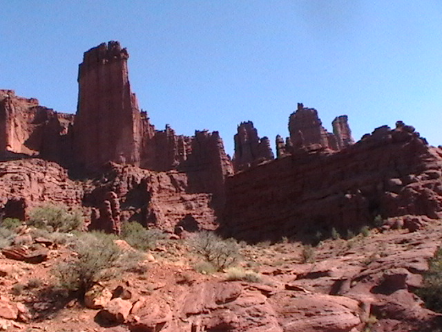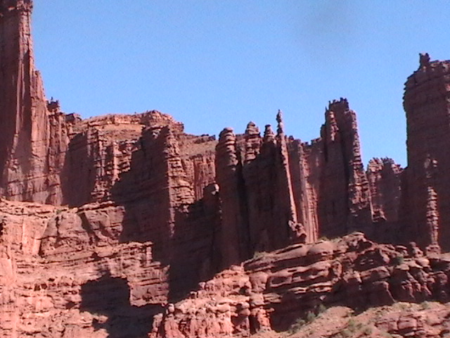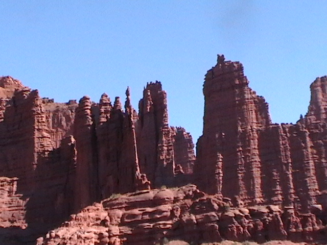 Fisher Towers are located along Utah State Route 128, a 40 plus mile long scenic drive that connects US-191 near Moab and Arch National Park to I-70. We were coming down from Vernal, Utah through Colorado State Route 139 toward I-70. Near the intersection of Rout 139 and I-70 there is a small town called Loma. There is a gas station where we could have bought sandwiches. But I made a mistake of not buying food, just fill up the gas tank. Once on I-70, we could have driven toward east for 4 miles into a much bigger town, Fruita, for food, but again I did not. My aim was a town called Cisco near the intersection of Route 128 and I-70 on the Utah side. It turnes out that Cisco is an abandoned railway depot with its stores deserted. Thus we drove to Fisher Towers with only a box of bite-size moon cake and plenty of water. About 12 miles from the northen end of Route 128 the road crosses over Colorado River. Right after the bridge there is a rest area along the river, equipped with a boat launching ramp into the river. We munched some moon cakes and took off to Fisher Towers. About 20 miles from the northern end of Rout 128 a dirt road toward east leads to the parking area of Fisher Towers. From the parking area the towers can be viewed without any problem. The distance of the trail from the parking area to the end of the area of those towers is 2.1 miles one way. There are three stacks of towers. The tallest tower, Titan, is located in the middle stack, about 1.1 miles away from the parking area. The trail is steadily down hill and passes some dangerous looking ledges. With half empty stomach and the fear of the steep climb back to the parking area, we did not descend very far. Some pictures of the towers are posted below. A nearby attraction is "Castle Valley". Due to the time constraint, we did not ventured into the valley. Some pictures of Castle Rocks from distance are included in the postings.