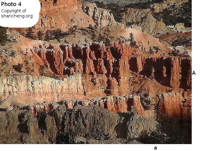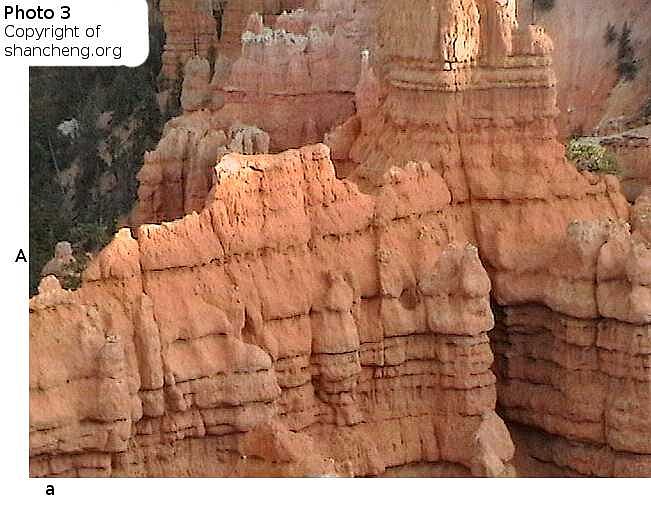 Photo 4This picture is deliberately over sharpened. At the position Aa, there is a hiker.The hiker wears a hat and carries a stick. The size of the hiker is as large as a hoodoo. |