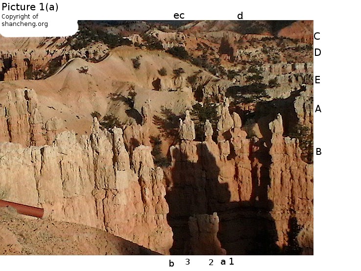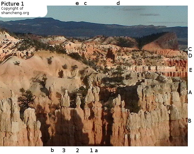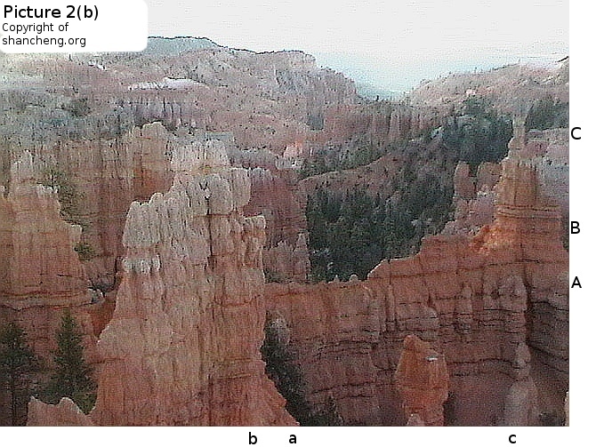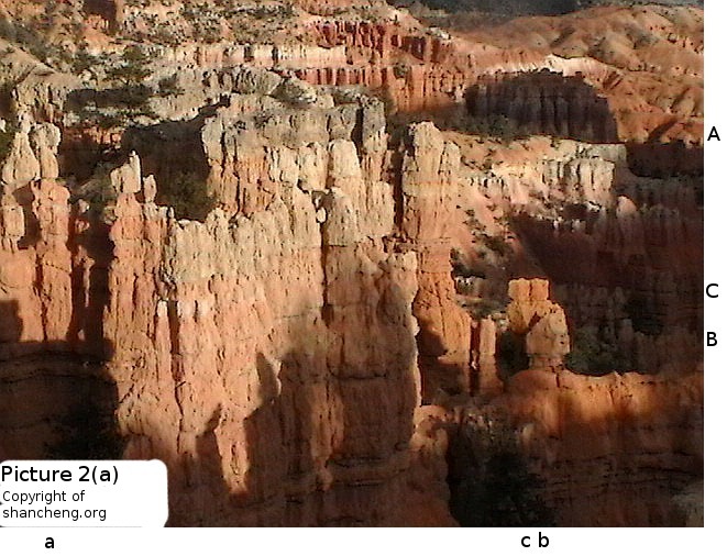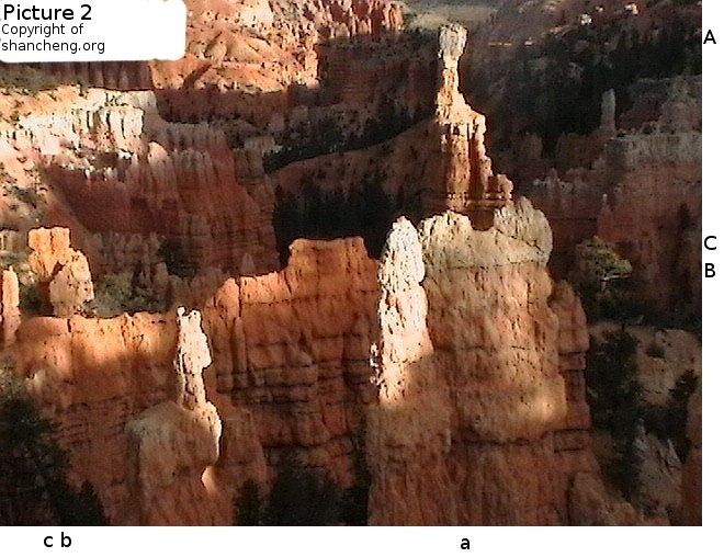 Picture 2bThe setting of Fairy Land is as follows: Viewers are looking toward east into thethe valley that is much smaller in size than the main amphitheater of Bryce Canyon National Park. The pictures from 1 to 2a that have been discussed so far were all taken around 7:45 pm on a clear day in the middle of October when the sun was about to set behind the hill at the back of the viewing point. Under such a lighting condition, the images on the poor resolution LCD screen of the Panasonic pocket camcorder were barely visible. Thus the pictures posted so far were not composed, but just random shots. The phantom images were all uncovered after wards when the pictures were examined. Many years ago when we visited Fairy Land at the middle afternoon of a summer day, two members of our party saw, with naked eyes, an elaborate picture of a little ballerina making the curtain call. After touring the main amphitheater on the way out, we revisited Fairy Land, but the little ballerina was gone. At a few successive visits to Bryce Canyon National Park, we always dropped by Fairy Land trying to find the little ballerina agian, but to no avail. That time equipped with a digital camcorder, many pictures were taken randomly with the hope to find the little ballerina, but instead many other phantom images have been found as reported here. The next morning after watching the sun rise at Bryce Point at the ridge of the main amphitheater, we stopped at Fairy land again and took some pictures. That time the camera was directly facing the eastern sun, nothing spectacular was expeced. However, Picture 2b as posted at the right reveals interesting aspects. The scene in the picture is clearly comparable with the scene in Picture 2. At the position Cc, the tall stone column is without any doubt the old man on the the chair in Picture 2. In the washed out portion by sun light, we can still trace out a dim contour of the face of the old man. The wall at the fore front is exactly the wall where the "Short Hair Beauty" is lurking out in Picture 2. At the position Aa we can even identify the crack on the wall to pin point the exact position of the image of "Short Hair Beauty". At Bb the twin column from Picture 2 are there, and at its foothill there extends another distant wall. The image of "Short Hair Beauty" was created by the projection of light on this distant wall. Some bush visible at the corner of the wall and the nearby stone must be the thing that obscure the lip of "Short Hair Beauty". |